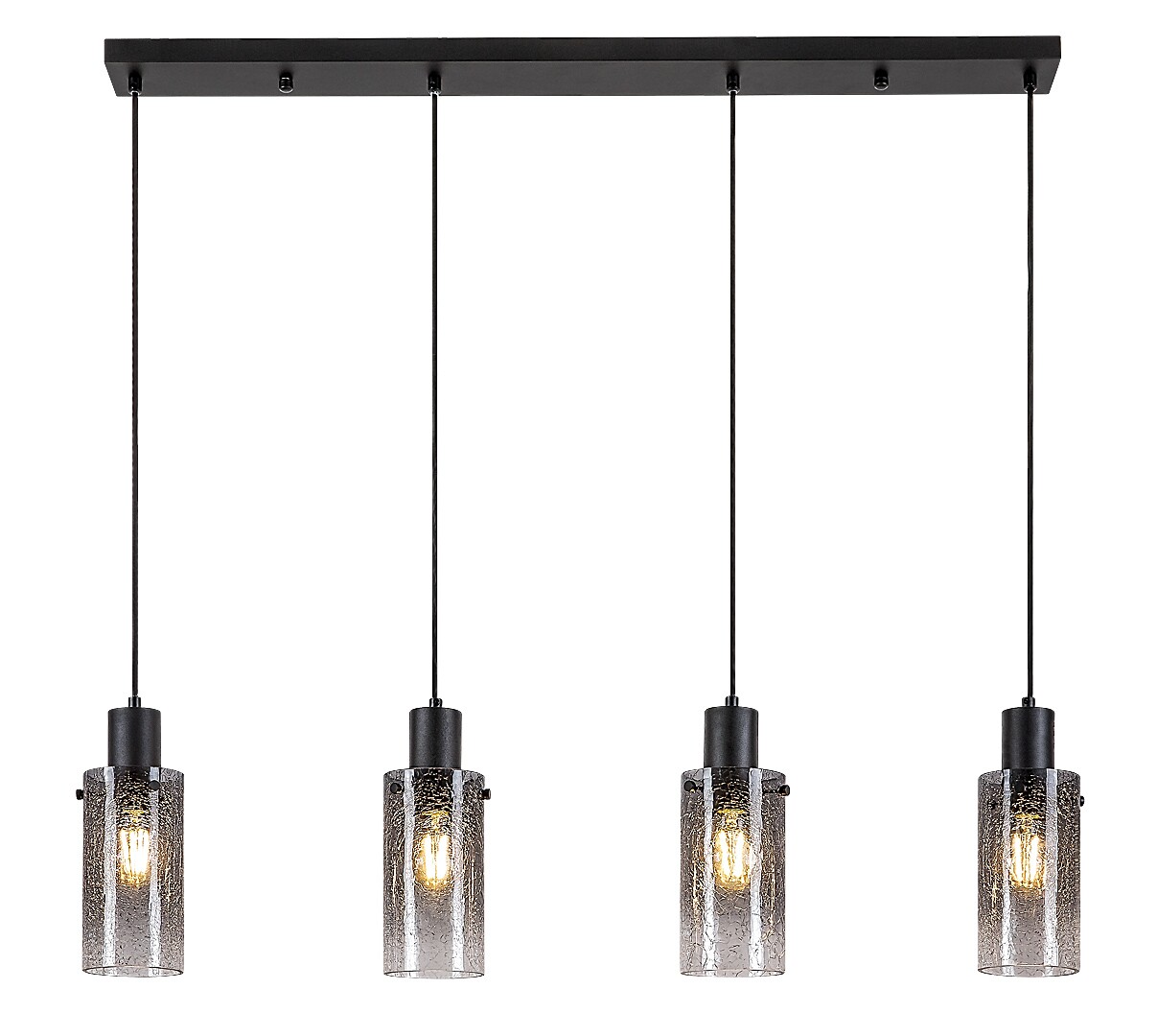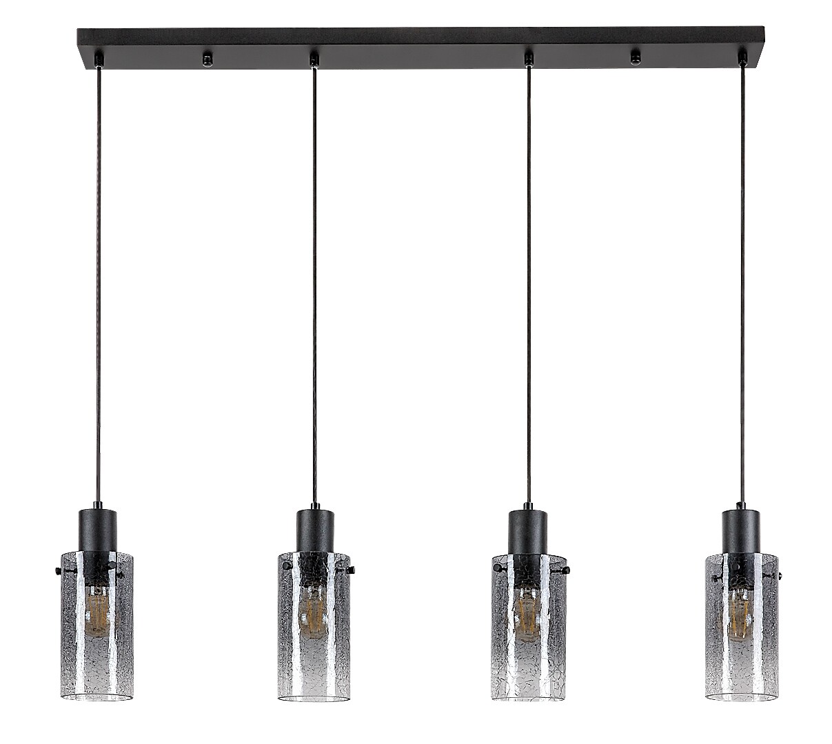 La lampada a sospensione Rabalux Fumea a 4 luci è consigliata principalmente agli amanti dello stile vintage. Con il suo aspetto sobrio, questo modello può essere integrato in diversi ambienti della casa: può essere installato nel soggiorno, in cucina, nella sala da pranzo o anche nella camera da letto. La lampada è composta da una struttura in metallo nero e da paralumi cilindrici in vetro fumé. Può essere fissata al soffitto tramite una base decorativa lunga e quadrata, alla quale sono collegati i quattro portalampada, sospesi in fila, uno accanto all’altro, alla stessa altezza. La lampada può essere utilizzata con quattro lampadine, ciascuna con una potenza massima di 60 W. Il tipo di attacco è E27. Poiché i paralumi lasciano intravedere le sorgenti luminose, è consigliabile utilizzare lampadine esteticamente gradevoli con forme non convenzionali. La lampada a sospensione a 4 luci è fornita senza sorgenti luminose.