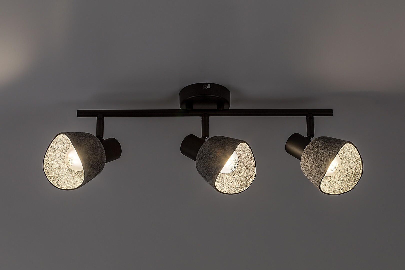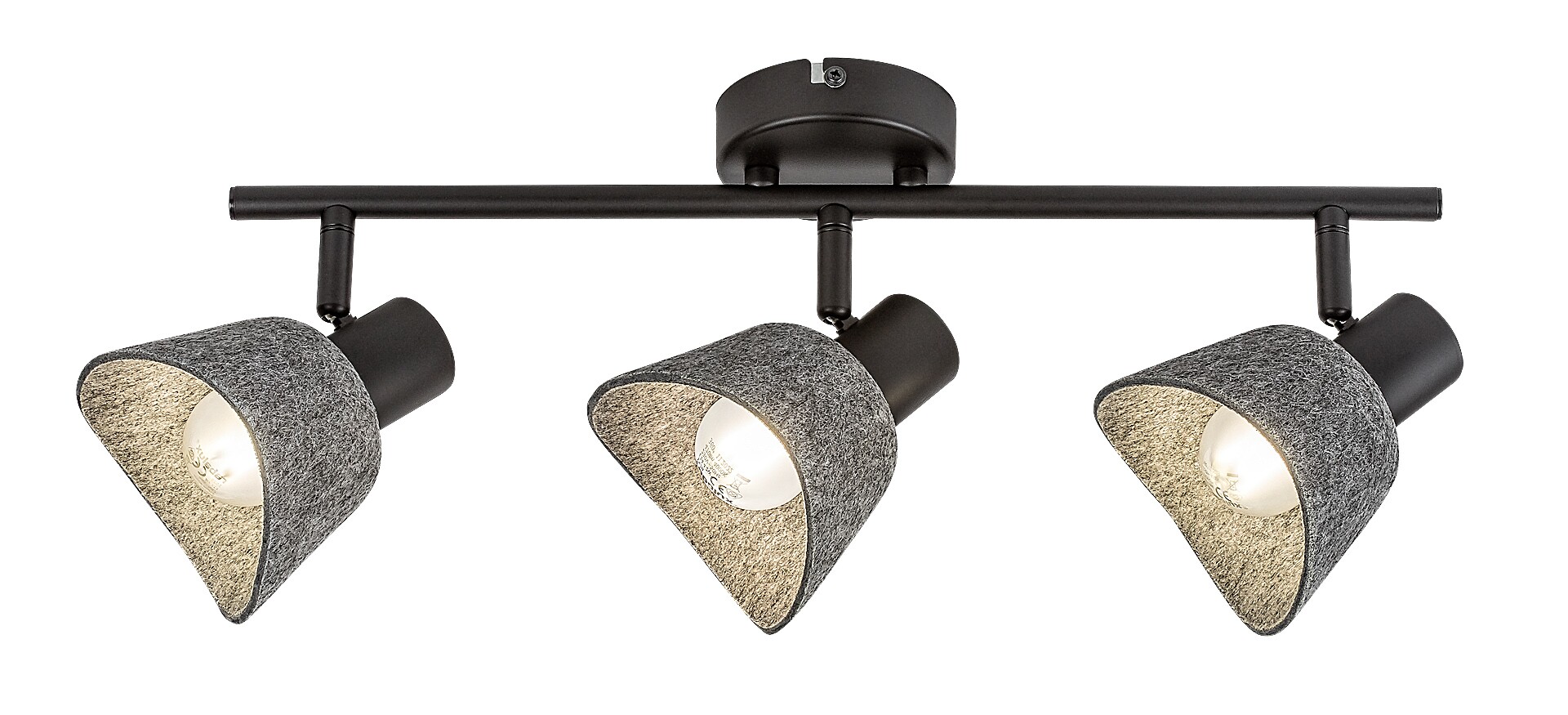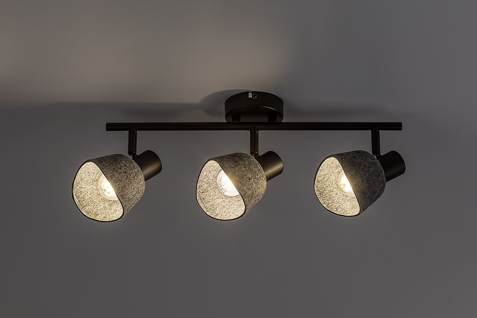 Il faretto da soffitto a 3 luci Rábalux Farelia è consigliato a chi ama le luci dal design originale che contribuiscono a creare un’atmosfera accogliente. Questo modello è realizzato in metallo nero con paralumi in feltro grigio. Il materiale del paralume è in feltro ecologico, prodotto con materiali riciclati. La lampada può essere fissata al soffitto tramite una piccola base decorativa rotonda, alla quale è collegata una barra cilindrica lunga che sostiene le testate delle lampade. La forma curva dei paralumi a campana, combinata con il morbido materiale in feltro, conferisce alla lampada un aspetto piacevole e accogliente. È la scelta ideale per il soggiorno, la camera da letto o lo studio. Può essere utilizzata con tre lampadine, ciascuna con una potenza massima pari a 10 W. Il tipo di attacco è E14. Il faretto a 3 luci è dotato di testate flessibili e pratiche. La lampada viene fornita senza sorgenti luminose.