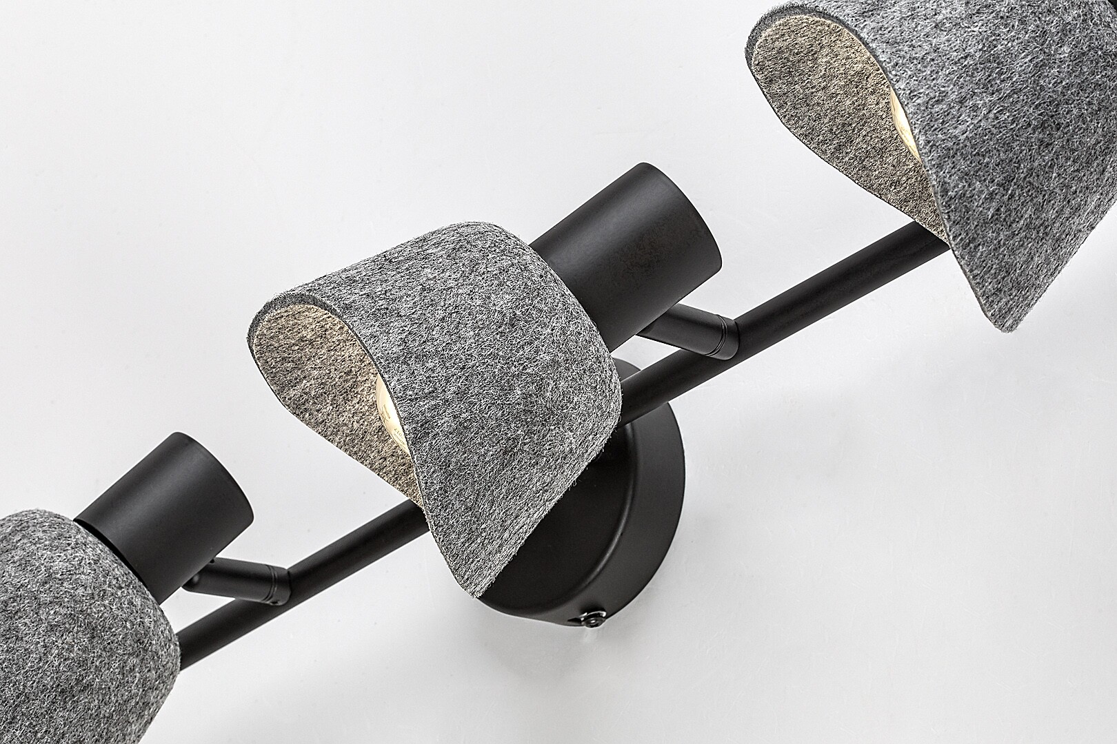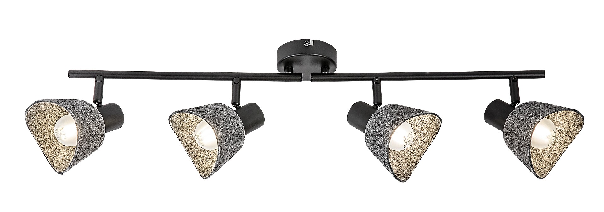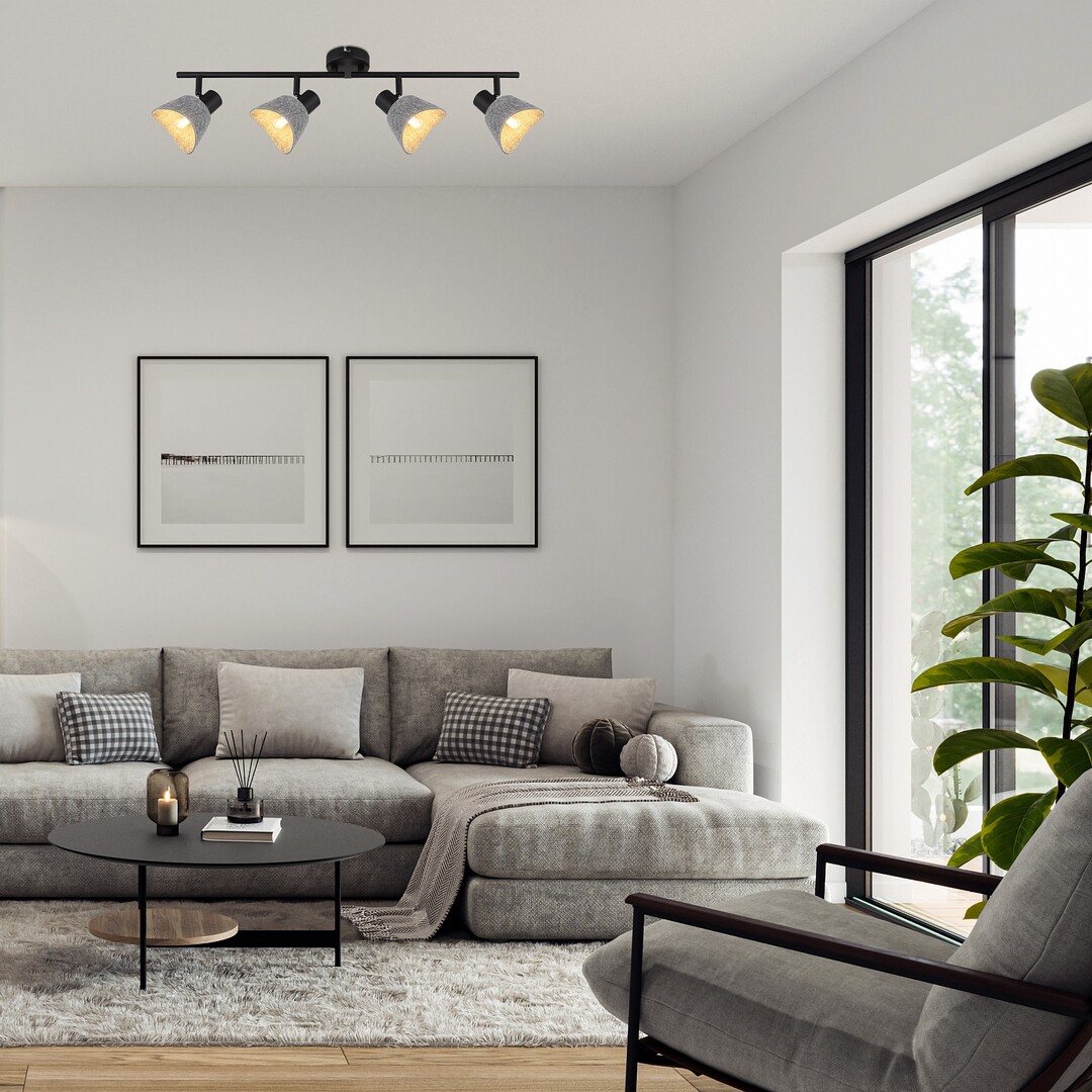 Il faretto da soffitto a 4 luci Rábalux Farelia è consigliato a chi cerca una lampada dal design originale per la propria casa moderna, che contribuisca a creare un’atmosfera accogliente. Questo modello è realizzato in metallo nero con paralumi in feltro grigio e può essere fissato al soffitto tramite una piccola base decorativa rotonda. Il materiale del paralume è in feltro ecologico, prodotto con materiali riciclati. Le testate delle lampade sono sorrette da una lunga barra cilindrica. La forma curva dei paralumi a campana, unita al morbido feltro, conferisce alla lampada un aspetto gradevole e accogliente. È la scelta ideale per il soggiorno, la camera da letto o lo studio. Può essere utilizzata con quattro lampadine, ciascuna con una potenza massima pari a 10 W. Il tipo di attacco è E14. Il faretto a 4 luci è dotato di testate flessibili. La lampada viene fornita senza sorgenti luminose.