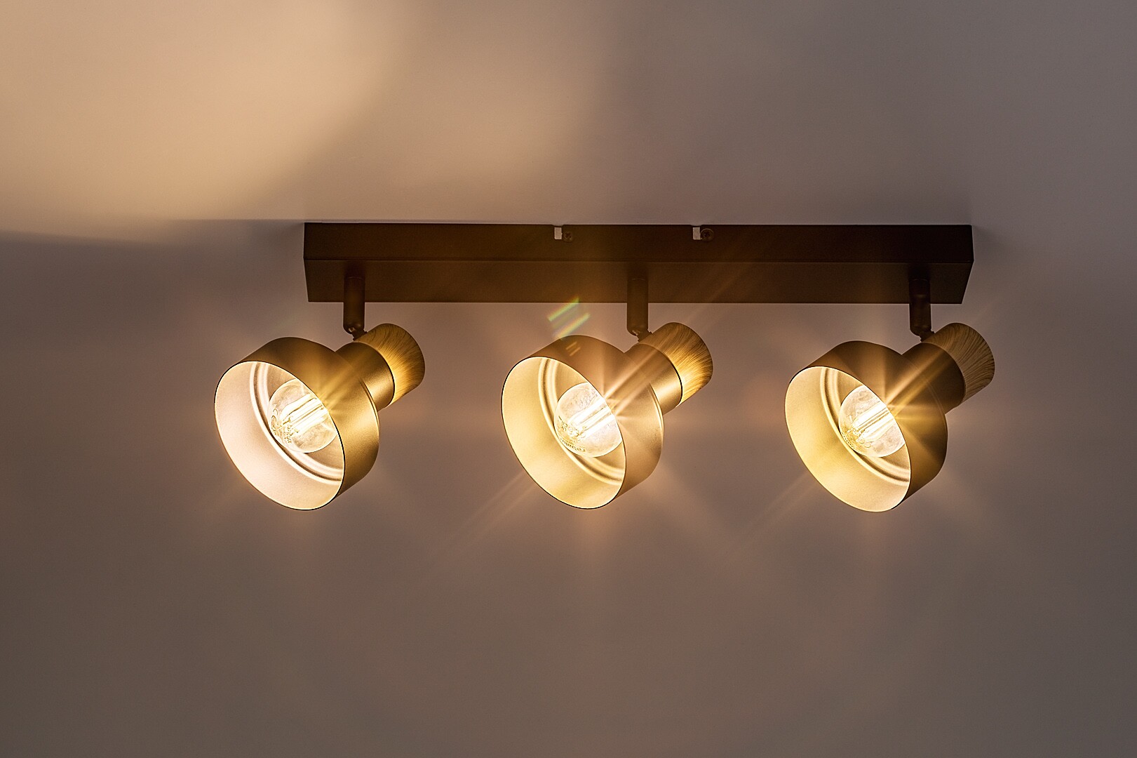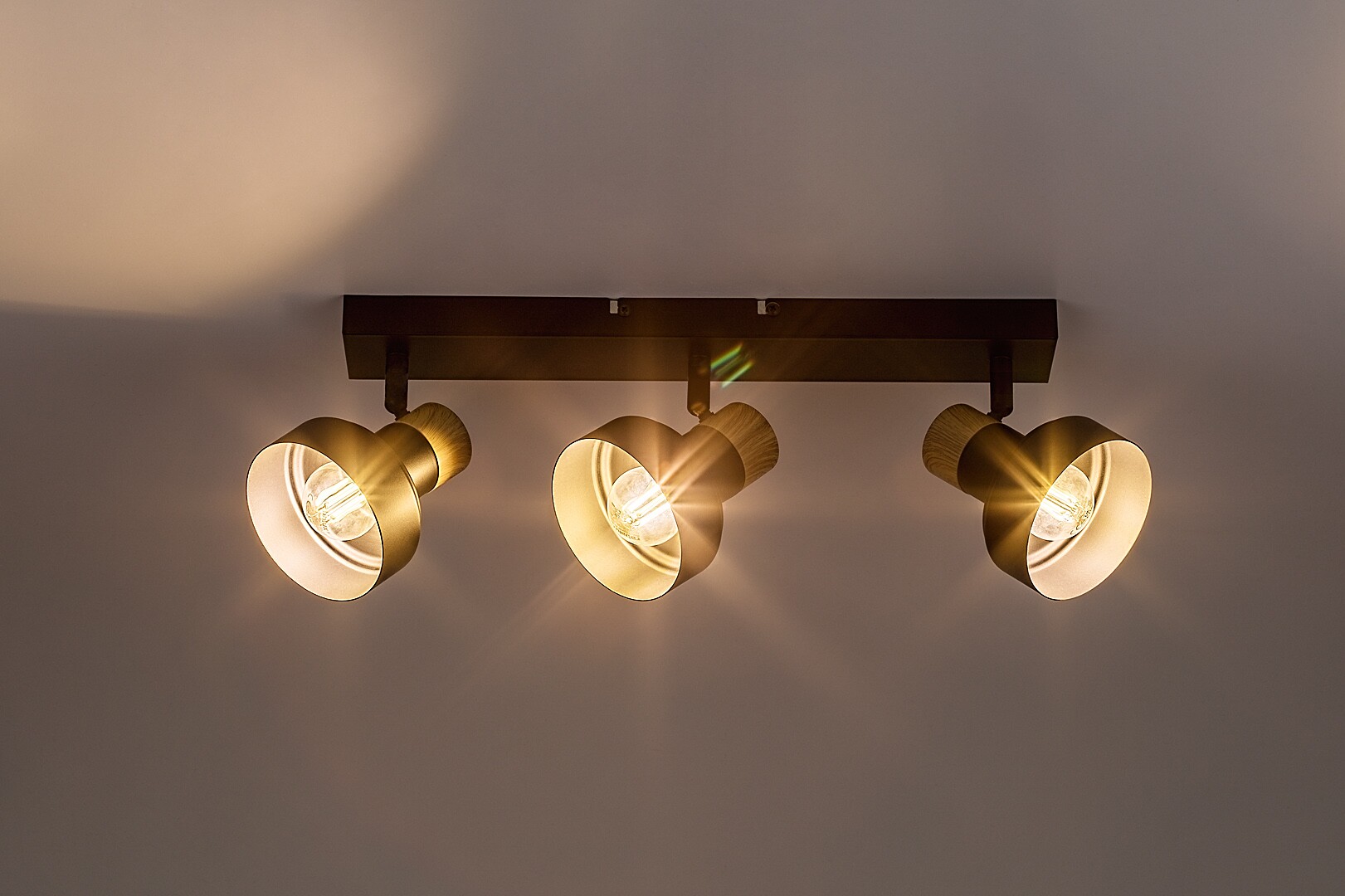 Il faretto da soffitto a 3 luci Rábalux Saskia è consigliato principalmente agli amanti dello stile nordico. La lampada è realizzata in metallo e legno nei colori nero e rovere. L’elegante tonalità scura della struttura e della base decorativa è interrotta solo dai dettagli in rovere, che aggiungono un tocco naturale al design della lampada. L’interno dei paralumi è dorato, in perfetta armonia con la tonalità naturale del legno. La base decorativa è caratterizzata da una forma rettangolare allungata. Su di essa sono fissate tre testate orientabili che permettono di distribuire la luce nella stanza secondo le proprie esigenze. La lampada da soffitto è la scelta ideale per il soggiorno, la camera da letto o lo studio. Può essere utilizzata con tre lampadine, ciascuna con una potenza massima pari a 15 W. Il tipo di attacco è E14. La lampada viene fornita senza sorgenti luminose.