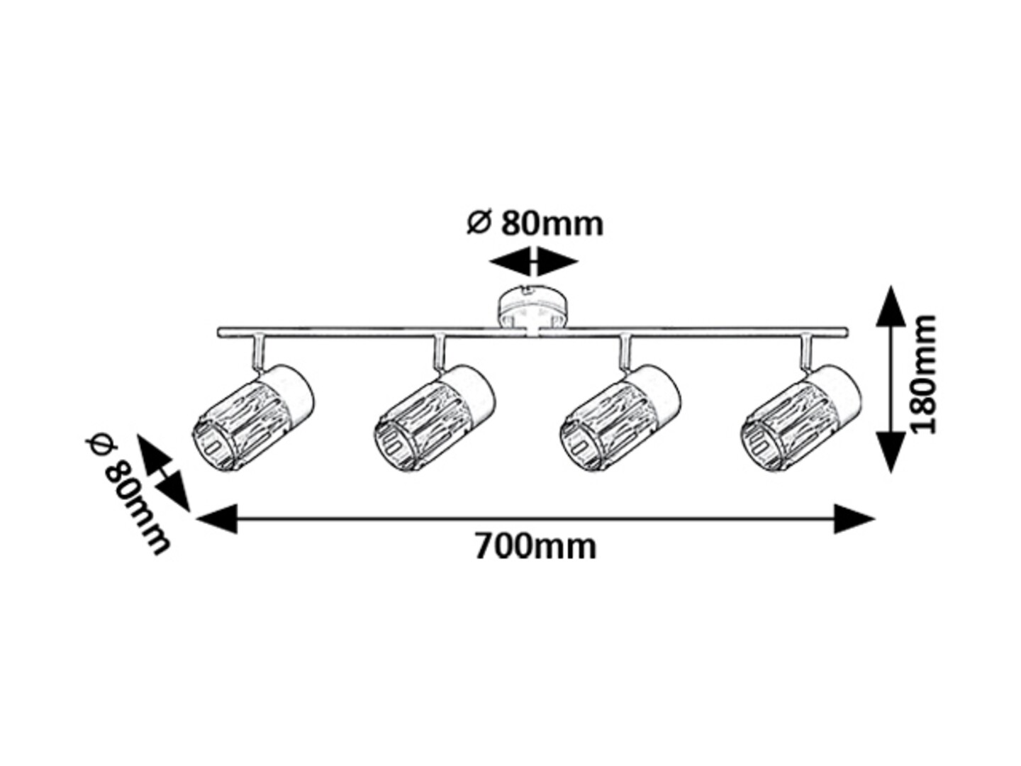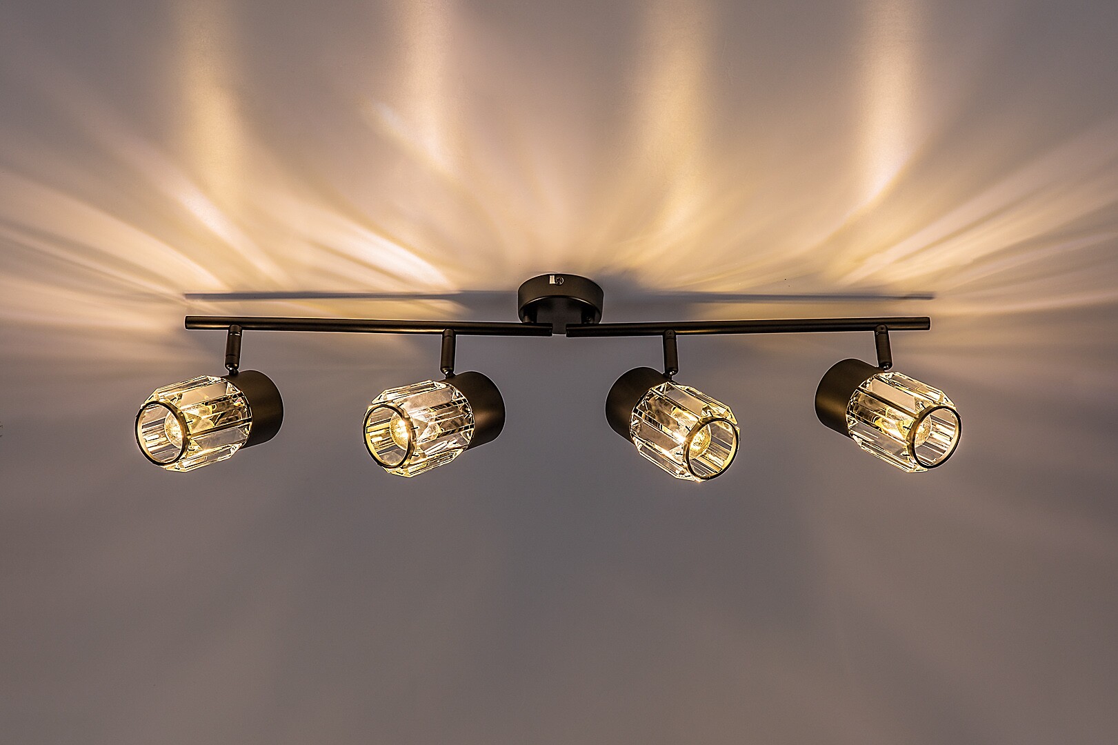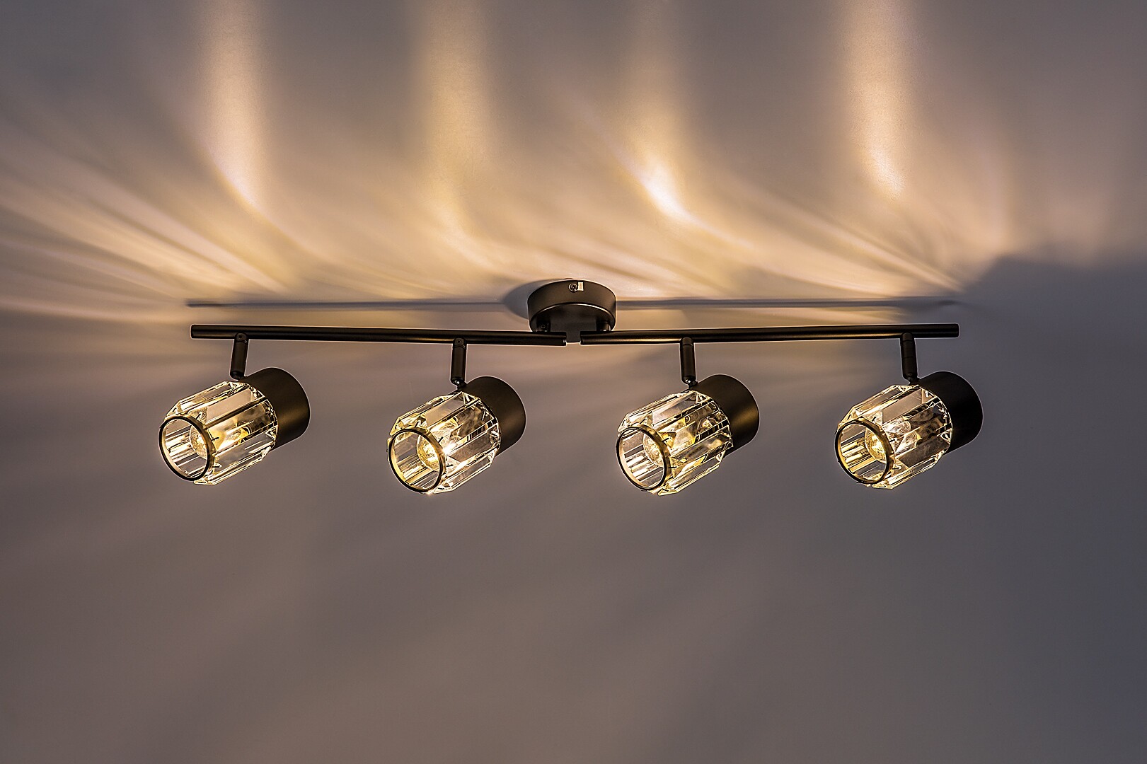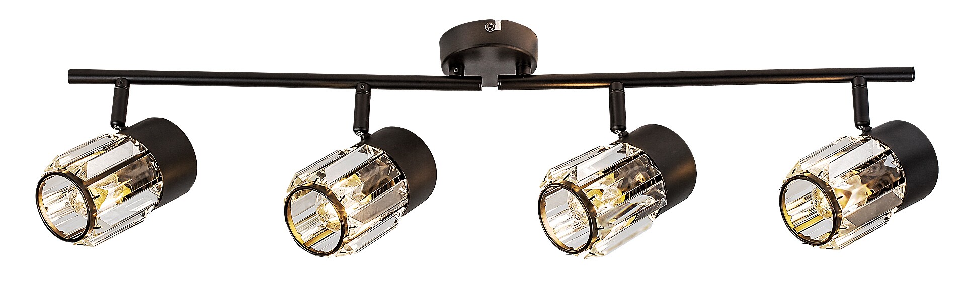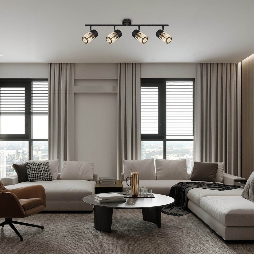 Il faretto da soffitto a 4 luci Rábalux Venaro è consigliato a chi cerca una lampada in stile classico, adatta anche agli ambienti più spaziosi della casa. Il faretto è realizzato in metallo nero e può essere fissato al soffitto tramite una piccola base decorativa rotonda. Le testate delle lampade sono disposte in fila, una accanto all’altra, su una barra di supporto collegata alla base decorativa. I paralumi, realizzati in vetro, hanno una forma cilindrica e una superficie simile al cristallo. Le testate possono essere orientate grazie agli snodi sferici, così da dirigere la luce secondo le proprie esigenze. Questo modello è ideale non solo per il soggiorno e la camera da letto, ma anche per la cucina e la sala da pranzo. Può essere utilizzato con quattro lampadine, ciascuna con una potenza massima pari a 15 W. Il tipo di attacco è E14. La lampada da soffitto viene fornita senza sorgenti luminose.